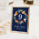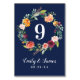 Rustiska romantiska kort för bordsnummer i stil har ett monogram för snyggt med siffror inramade av en blommigt vattenfärgad andedräkt med vackert ro, dahlias, blommor och grönt, i en underbar höstpalett med burgröd, gyllene gult, persikofärgad orange, bröllop och rosans nyanser. Rikens marinblå bakgrund färg.