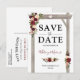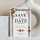 Höstbröllop spara datum vykort med en klass chic vit bakgrund som kan ändras till valfri färg, en stilren burgundy, marsala röd & rosenskön akvarell blomsterarrangemang på en rustik trädgalleri, ett skulpterat hjärta med parets initialer, och en modern spara datum mall.