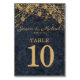 Lägg till lite elegans till din mottagning bord med det här dubbla-sidiga bordsnumret-kortet från Rustic Glam Bröllop Collection. Med den lysande guld-strängen ljus och bkeh över en marin faux-denim-bakgrund blandar det här kortet rustik charm med sofistikerad detaljrikedom. Varje sida visningar bordsnumret i fet guld-text för att det ska vara lätt att se det från alla vinkla perfekter - runt bord eller stora platser. Anpassa med din bröllop-dejt och pars namn för en polerad, samordnad titt. Det här kortet är designat att para med matchande skylt, menyer, placeringskort och inbjudningar. Det kompletterar ditt sammanhängande bröllop-kontorsprogram i stil.