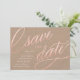 Rustika, chic rosa guld spara datum-kort har elegant skrivstil i en falsk rosa guld folie-effekt på en grå bakgrund, med information om bröllopsannonsering i vitt. Baksidan har ett trendigt rosa guld randmönster.