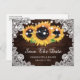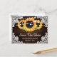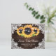 Anpassade rustika solros bröllop spara datum vykort med solrosor mot en rustik träbakgrund prydd med vit blomsterduk och strängljus. Vårt rustika solros bröllop spara datum vykort är perfekt för en rustik landsbygd eller lada bröllopsfest inspirerad av solrosor.