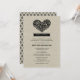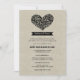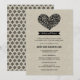 Enkla och söta bröllopsrepetitioner och middagsinbjudningar med ett blomstert hjärta, monogram-banner, en unik kreativ formulering intro och ett mönster av blommor på baksidan. Svart design och text på rustik linne / burlap strukturerad bakgrund.