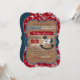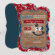 Lantlig cowboy-tema baby shower inbjudan. Med tryck av röd bandana och med en look som jeans samt en gunghäst. Färgerna är röd, blå, bruna och vit.