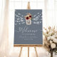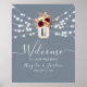 Sätt tonen för din bröllopsfirande med detta eleganta men rustika välkomstskylt, med en dammig blå bakgrund, lysande strängljus, en monogramförsedd masonburk och burgunderfärgade blommor. Perfekt för höst- eller vinterbröllop med en romantisk lantlig känsla. Fullständigt redigerbar text.