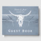 Dammig blå vit rustik tjur ko skalle country western cowboy bröllop minnesbok gästbok. Vintage bondgårdsstil tryckt slitna textur. Vilda västern inspirerad gammal antik. Cool, trendig, modern bondgård djur design. Anpassa ditt manus på framsida, rygg och baksida. Bild upphovsrätt Marg Seregelyi Photography.