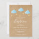 Perfekt för att inbjuda vänner och familj till en speciell dopdag. Med söta blå moln och gyllene stjärnor på snören, på en rustik kraft bakgrund. Lägg till dina festdetaljer i vitt för att skapa den perfekta inbjudan.