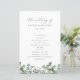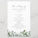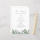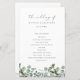 Färdigställ din bröllopsutstyrsel med ett vackert ceremoniprogram med akvarell-eukalyptus och mjuk grå typografi. Anpassa baksidan för att lista medlemmarna i din bröllopsfest.