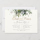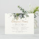 Vattenfärgade blommor, rustiskt blått gummi och grönaktigt arrangemangare med vackra mörkar av Eucalyptus foliage. Handlade med elegant och moderna faux guld handskrivna manus Rehearsal Dinner Inbjudningar. DIY-bakgrund färg.