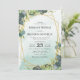 Eukalyptus bröllopsinbjudningar med en rustik urblekt akvarell tvättad bakgrund, en guld glitter geometrisk form, eleganta gröna botaniska blad, stänk av falskt guld folie, och en enkel bröllopsmall som är lätt att anpassa.