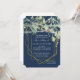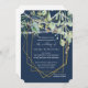 Modernt enkelt med en touch av rusticitet. Perfekt för ett utomhusbröllop under träden. Handmålade akvarell-eukalyptusblad med frön och strängljus över en marinblå bakgrund. Upphovsrätt, Audrey Jeanne Roberts.