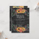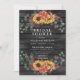 Rustika grå ladugårdsträ burgunder eukalyptus solbröllopsinbjudningar med akvarell solrosor eukalyptusblad och solrosbukett bak