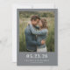 Denna bröllops-"spara-datum"-inbjudan presenterar ett gripande fotografi av ett par som omfattar varandra i en fält omgiven av högt gräs. Designen är inramad med en solid grå kant och innehåller anpassningsbar text för datum och namn, satta i eleganta serif-typsnitt som ger en touch av sofistikation. Färgpaletten består av naturliga gröna och bruna toner från bakgrunden, kontrasterade med denimblått, vilket skapar ett rustikt och intimt tema. Den övergripande stämningen är varm och personlig, perfekt för att fira kärlek och gemenskap på er speciella dag.