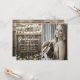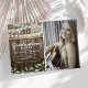Rustika inbjudningar till examensfest med lantlig lada ekfat bakgrund, ett foto av examenklassen, gnistrande strängljus, elegant vattenfärg grönska, examensår och modern vit text.