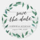 Den här rustika "Spara datum"-dekalen med italiensk Ruscus och orden "spara datum" i trendig handskrift, allt mot en blek trädgårdsbakgrund.