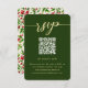 Svarskortet från bröllop har ställe för din QR-kod så att gästerna enkelt kan osa på din bröllop webbplats. Framsidan har en enkel och ren layout med trendigets skripttypografi och gröntens bakgrund. Baksidan är ett vackert botaniskt bär och grönt helgdag, perfekt till jul- eller vinterbröllop.