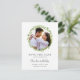 Rustic sparar datumet på vykortet med ditt foto inuti en grönt av löv-andedräkt. Namn finns i ett handskrivet skript och dina uppgifter i ett medelstort grått-teckensnitt på baksidan. Denna utformning är underbar för en sommar bröllop.