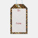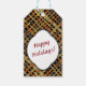 Grafiska diagonala trådar i färgaden av vävt material som bildar en roligt mönster. Golden till grått-jorden färg ge är en rustik vib för Helgdagarna! Kryssen täcker hela presentens märkre. På framsidan finns ett runt vitt fält där du kan lägga till ett kort hälsning - som standard "Glad helg!" - som alla är något diagonalt placerade. På baksidan finns en genomskinlig vit ruta med utrymme för mottagarens och donatorns namn. Som standard skrivs all text i röd mörk. All text kan enkelt anpassas - eller så kan du ta bort den om du föredrar att allt skrivs för hand och är mer personligt.