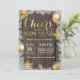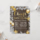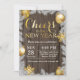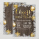 Rustik guld nyårsfest inbjudan. Gott nytt år. Guld snöflinga. Vit fjäder. Jul bröllopsdusch inbjudan. Guld och rustik träbakgrund. Landsbygd vintage retro lada. För ytterligare anpassning, klicka på "Anpassa"-knappen och använd vårt designverktyg för att ändra denna mall.