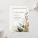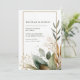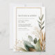 Bjud in dina gäster med en känsla av naturlig, underdriven elegans med denna minimalistiska rustika bröllopsinbjudan. Designen förankras av en ren, vertikal vit bakgrund som maximerar enkelheten och fokuserar på de naturliga elementen. En tunn, glänsande falsk guld glitter rektangulär ram ger en chic och elegant ram för din text. Höjdpunkten i designen är akvarellgrönskan, koncentrerad främst i det nedre hörnet och löper upp längs ena sidan. Lövverket har en vacker, dämpad färgpalett som sträcker sig från dammig salvia gröna blad och djupa eukalyptoner till varma terrakotta och brända orangea accenter, vilket antyder en höst- eller bohemisk tema. Ömtåliga gyllene botaniska kvistar och måleriska gröna stänkdroppar lägger till textur och gnista till den naturliga kompositionen. Denna boho trädgårdsstil är perfekt för par som planerar en utomhusceremoni, ett rustikt bröllop i en ladugård eller någon annan händelse som omfamnar jordnära, organisk sofistikation. Denna design är perfekt för rustika bröllopsinbjudningar, bohemiska bröllops