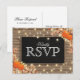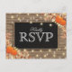 Rustika höstskördefester svar brevkort med lantlig chic trähuvud, svart tavla mittdel, rep, halloweenpumpor, höstlöv, ekollon, en strödd av höstlöv, stränglyktor och en personlig rsvp-mall.