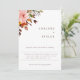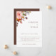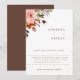 Vacker akvarell rustik höstlövverk och blomsterbukett i trendiga nyanser av orange, rost, rosafärgad och grön. Funktioner, rustik brun bakgrundsfärg och text. Modern design stil mall.