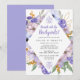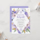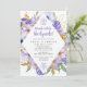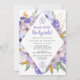 Eleganta lila och blå blommor skapar en diamantformad ram runt dina detaljer för brunschen efter bröllopet.