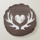 Söt jakt-tema hjort-antilop rund kastkudde-dekor. Personalisera med nygifta brud och brudgum / man och hustrus initialbokstäver. Vintage country chic hemdekor för bröllop, restaurang, café, sovrum, soffa, säng eller soffa. Romantiska utomhus-tema dekorationer. Rustika urblekta hjärtan med personliga namnmonogram. Väderbitet gammalt distressed-typografi. Brun trästrukturpanel bakgrund. Trädrallstextur. Utomhus jägare / jakt-tema.