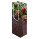 En presentpåse med ett strålfotografi av en brun bord med pinekoner, gräs nål, snö och julprydnader. Festiv och underbar.