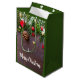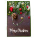 En presentpåse med ett strålfotografi av en brun bord med pinekoner, gräs nål, snö och julprydnader. Festiv och underbar.