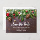 Spara datum-kort med ett rustikt fotografi av ett brunt träd bord med tallkottar, tallbarr, snö och juldekorationer. Festlig och vacker.
