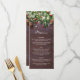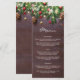 Rustika julmiddagsmeny kort med en mörk trähybridbakgrund, festliga julgransgrenar, röda och gyllene träddekorationer och stränga twinkellyktor.