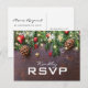 Upptäck charmen med traditionell julestetik med våra rustika vinterbröllopssvarskort. En unik blandning av en mörk trästruktur i kombination med fantasifulla julgransgrenar och gnistrande strängljus. De röda och gyllene dekorationerna tillför en festlig värme och säkerställer att varje mottagare känner en våg av julstämning och brölloppsglädje när det anländer.