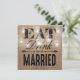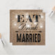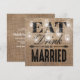 Dessa fantasifulla landsbygdbröllopets repetitionsmiddagsinbjudningar kommer som en matchande bröllopssats med en rustik brun jute-effektbakgrund, eleganta murarljus med stränglyktor, orden "ÄT, DRINK OCH VAR GIFT" och era repetitionsdetaljer på baksidan.
