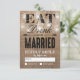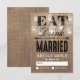 Dessa fantasifulla landliga bröllopssvarskort kommer som en matchande bröllopssats med en rustik brun jutesäckseffektbakgrund, eleganta murarljus med snurra och gnistrande ljus, orden "ÄT, DRICK OCH GIFT ER" och era bröllopssvarsuppgifter.