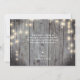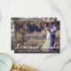 Rustik bröllopskort med tack med fullständigt foto, ett skrivet "kärlek och tack" och klassisk typografi. På andra sidan finns en trästruktur med strängljus. Anpassa meddelandet för att göra det till ditt eget.