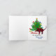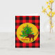Rustika festsasongens vikta gratulationskort med katt och julgran, anpassat familjenamn och personliga signaturer understrukna med rött och svart buffelrutmönster.