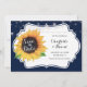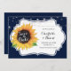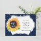 Rustic blommigt bröllop spara datum-kort med solrosa på ett vitt tecken och marin blå bakgrund.