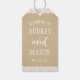 Klassisk rektangulär brölloppsgåvaetikett med "Bröllop För" med parets namn monogram och bröllopsdatum i elegant vit typografi, inramad av ömtåliga vita spetskanter på en varm kraftbakgrund. En charmig rustik accent för brölloppsgåvor och presenter. All text är helt anpassningsbar.
