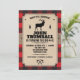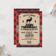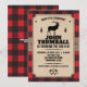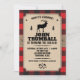 En bakgrund av rött buffalo-rutigt mönster kontrasterar mot en panel med kraftpapperslook som hålls på plats av en burlap-rem på detta inbjudningskort med Northwoods-tema. Panelen visar partyinformationen med en älg mellan två tallar. Den korsade yxan utgör en anpassad logotyp nedan. Perfekt för en födelsedag, svensexa, säsongsfirande eller en buffalo-rutig eller lumberjack-tematisk fest. Tillgänglig med matchande produkter.