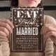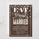 Med en rustik trähydd bakgrund, romantiska stränglyktor, orden "ÄT, DRINK OCH BLI GIFT" och din bröllopsinformation.