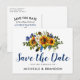 Akvarell boho marinblå & gul save the date-kort med en klassisk vit bakgrund som kan ändras till valfri färg, en solrosblomsterdisplay, fjädrar och en modern save the date-mall.