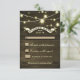 RUSTIKA LANDSBYGD BRÖLLOP SVAR KORT med slitna träbakgrund, gnistrande strängljus och stilfull typografi med en banderoll.