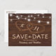 Rustika landshögstids vykort för att spara datumet med en lada träbakgrund, två utskurna hjärtan, era initialer och en redigerbar textmall.
