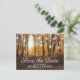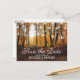 Utomhus höst spara datum vykort med skogar täckta av röda, orange och gyllene gula höstlöv, sträng med blinkande ljus och en elegant redigerbar mall för bröllop spara datum.