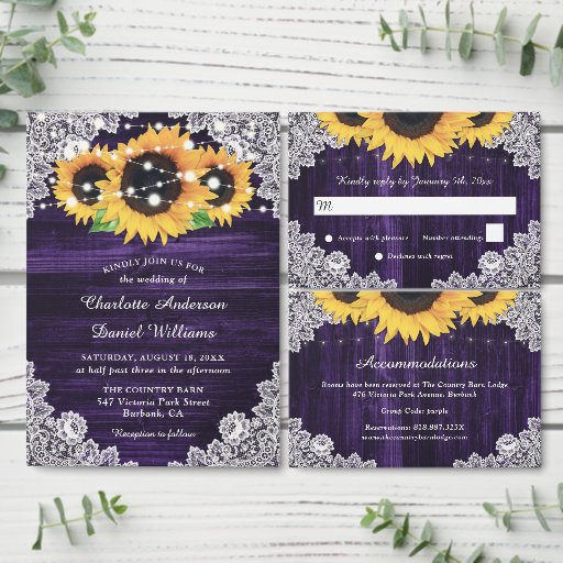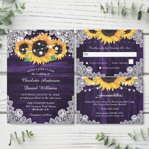 Elegantens inbjudningar till solrosbröllop är idealiska för en romantisk lila rustik bröllopsfest inspirerad av solrosblommor. Matchande objekt är tillgängliga.