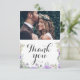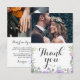 Tack vare det här rustiska bröllop-kortet kan du visa ursprungliga vattenfärgsbilder av ömtåliga lila blommigtar och sage grönt eukalyptus, vilket ger en naturlig elegans till ditt hjärtliga budskap. Med en rolig kalligrafi och plats för två av dina favoritfoton från bröllop, fångar det här kortet på ett vackert sätt andan i din speciella dag. Perfekt för att ha lagt till en personlig och minnesvärd beröring, gör det möjligt för er att uttrycka er tacksamhet på ett sätt som vänner och familj kommer att vårda.
