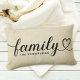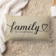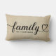En personlig lumbalpåse med Familj i flytande svart hjärtskrift med en anpassningsbar efternamnsmonogram på en texturerad beige linnebakgrund. Den rustika, lantliga designen gör en charmig accent för vardagsrum, ingångar eller familjesamlingar. All text är fullt redigerbar för att anpassa med din familjs efternamn. En varm husvärmegåva.