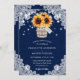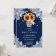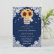 Rustic navy blue solros bröllopsinbjudningar med solros och baby utandning bouquet inuti en mason burk på en brännpunkt och blommigt snöre bakgrund. Utformning av perfekt för att bjuda in dina gäster till ditt marinblå landsbyggsbröllop party inspirerat av solblommor. Enkel att anpassa kortet.