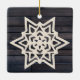 Färsk fotokeramisk ornament med rustiskt modernt papercut snöflingor och din egen anpassningsbar namn och år på en gårdsplan för träskivor av mörken stil. På baksidan finns en annan homemade papercut snowflake.