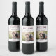 Eleganta bröllopsvinetiketter med parets namn i elegant mörkröd typografi ovanför ett anpassat foto, med vindruvsvarianten i graciös kalligrafiskrift och en dekorativ rullande accent på en ren vit bakgrund. Den fotoframåtriktade layouten skapar en vacker personlig vinflaskefavor för ditt bröllopsfirande eller brudshow. All text och foto är helt anpassningsbara.